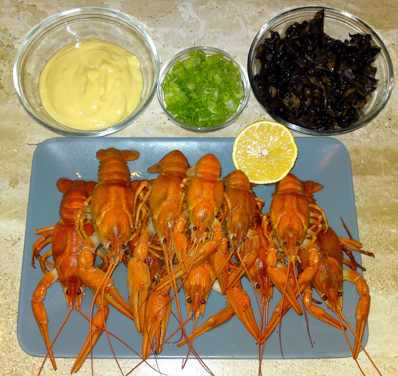 Acum ii putem gati in diferite retete. Eu pentru ca aveam ciupercile din padure, am ales sa fac o salata simpla si foarte gustoasa. Foarte gustoasa. Pentru asta am lasat racii sa se raceasca in apa in care au fiert. Intre timp am facut o maioneza din 100 ml. de ulei, un galbenus, zeama de la o jumatate de lamaie, o lingurita de mustar, sare si o jumatate de lingurita de zahar. Pentru ca racii tot nu se racisera, am sotat (calit) si ciupercile pe care inainte le-am spalat foarte bine sub jet de apa rece. Am lasat si ciupercile la scurs si racit si am curatat si tocat doua fire de ceapa verde si 2 graunti de usturoi.