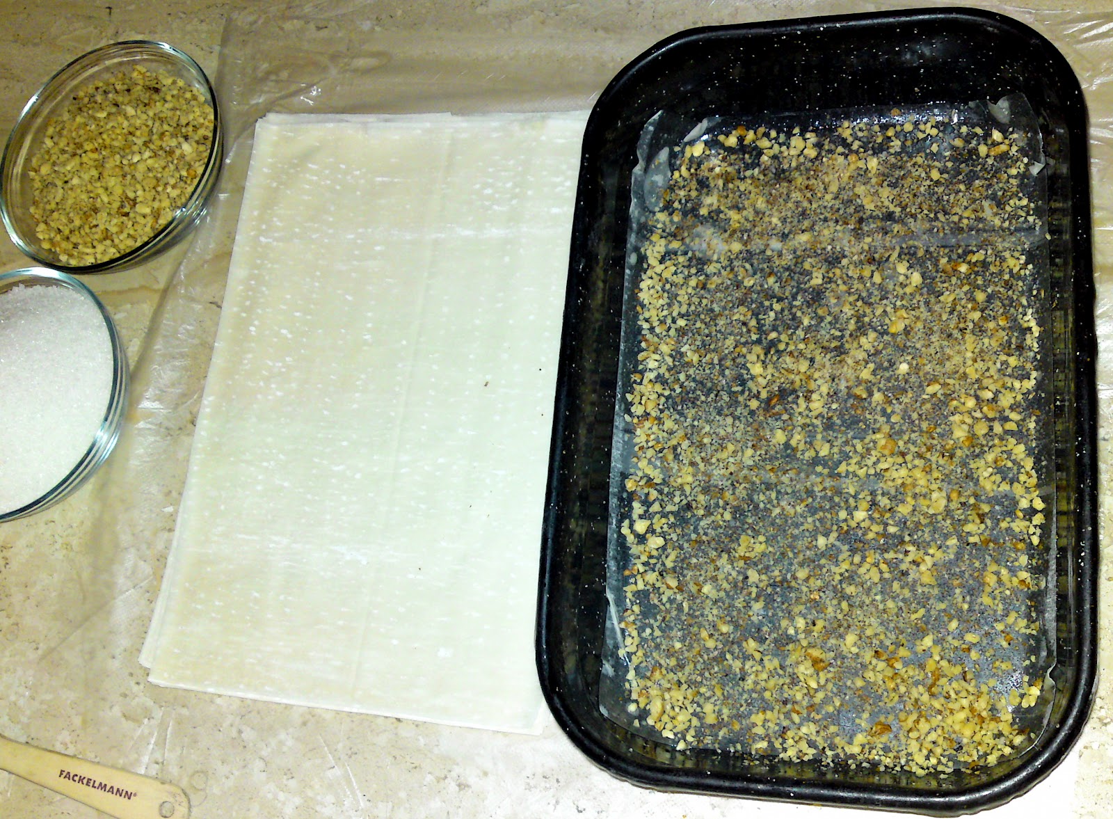 Pentru inceput topim untul, macinam nuca, decongelam foile de placinta daca avem foi congelate si pregatim tava de copt.